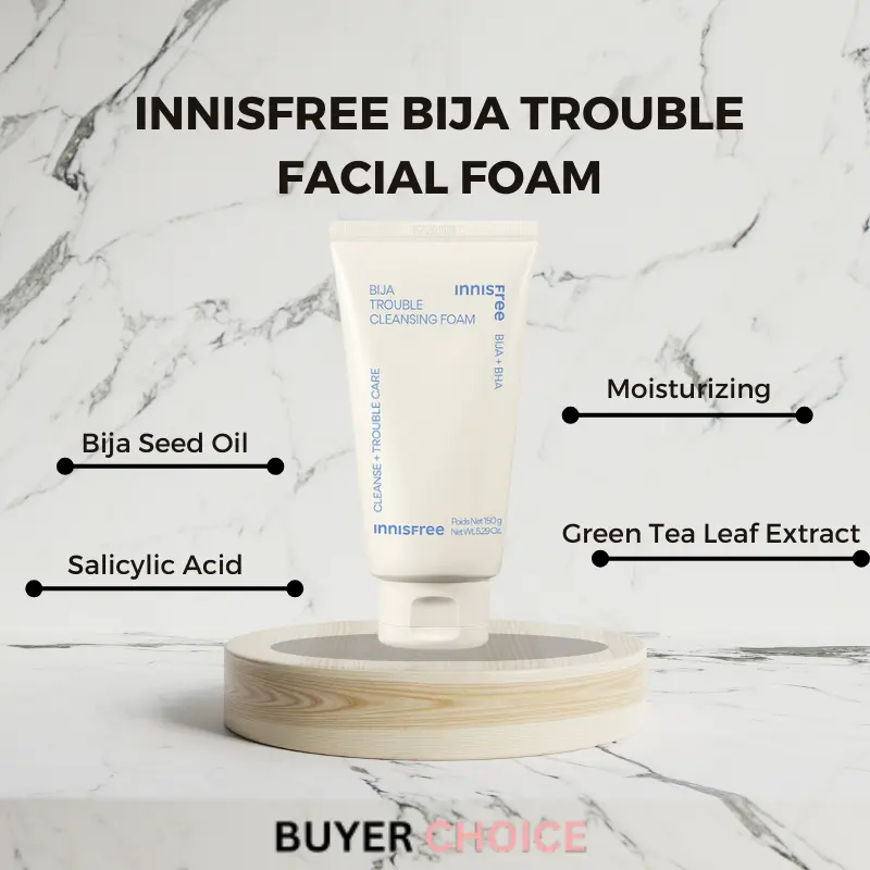 โฟมล้างหน้าหน้าใสตัวดังจากแบรนด์อินนิสฟรี Innisfree Bija trouble facial Foam คลีนซิ่งโฟมเนื้อเนียนนุ่มที่ไม่ควรพลาด รู้สึกสดชื่นหลังทำความสะอาดทันที มีประสิทธิภาพในการช่วยทำความสะอาดใบหน้าได้อย่างหมดจด ฟื้นฟูผิวเสีย และปลอบประโลมผิวสำหรับผู้ที่มีปัญหาสิว เรียกได้ว่าดีจนรีวิวแน่นสุด ๆ แถมราคาสบายกระเป๋าอีกด้วย