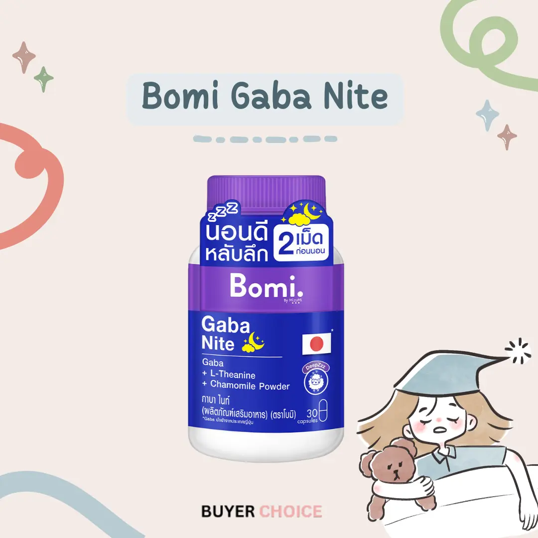 โบมิ กาบาไนท์ วิตามินช่วยเรื่องนอนหลับยอดฮิตที่น่าสนใจ จะช่วยให้คุณนอนหลับได้ง่ายขึ้น หลับลึก หลับสบาย ลดความเครียด และปรับคลื่นสมองให้ผ่อนคลายยิ่งขึ้น ด้วยสารสกัดที่สำคัญหลายชนิดจากญี่ปุ่น ทานได้ทุกวันไม่มีผลข้างเคียง และไม่ส่งผลเสียต่อการนอนเมื่อหยุดทานแล้ว เรียกได้ว่าเป็นวิตามินนอนหลับที่น่าสนใจสุด ๆ