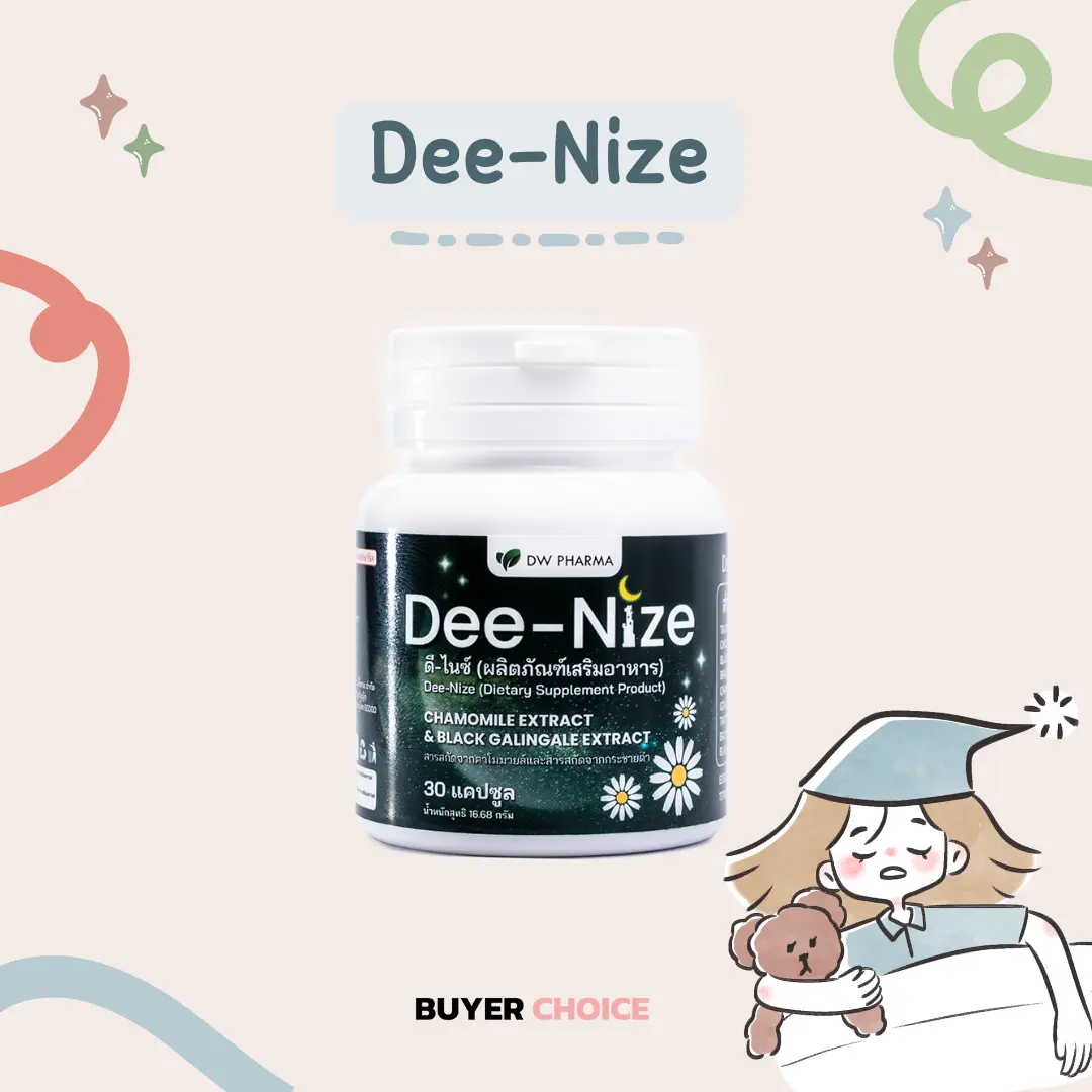 เพราะ Dee-Nize เป็นผลิตภัณฑ์เสริมอาหารจากธรรมชาติ 100% ที่ช่วยปรับสมดุลการนอนหลับอย่างอ่อนโยน ปราศจากสารเคมีที่ก่อให้เกิดผลข้างเคียง ไม่ใช่ยานอนหลับ แต่ช่วยให้คุณนอนหลับได้อย่างมีคุณภาพด้วยสารสกัดจากธรรมชาติ ช่วยกระตุ้นการสร้างฮอร์โมนเมลาโทนิน ทำให้คุณง่วงนอนและหลับได้ง่ายขึ้น ตื่นเช้ามาสดใส ด้วยแบตเตอรี่เต็มร้อย พร้อมลุยกับทุกกิจกรรม