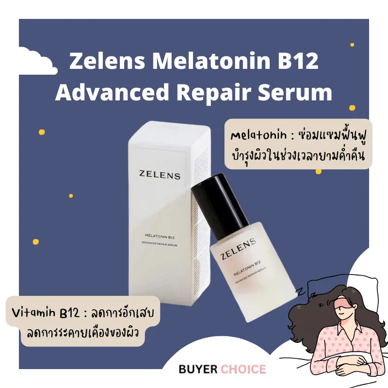 Zelens Melatonin B12 Advanced Repair Serum สกินแคร์ Melatonin ที่อยากจะมาแนะนำให้กับสาว ๆ ได้ทำความรู้จักกันมากขึ้น น้องคนนี้เป็นเซรั่มซ่อมแซมผิว เสริมเกราะป้องกันผิว และลดริ้วรอยร่องลึกของผิวได้เป็นอย่างดี ด้วยส่วนผสมหลักที่อุดมไปด้วยเมลาโทนินที่เสริมด้วยวิตามินบี 12 และอีกมากมาย เพื่อให้ตอบโจทย์ต่อการบำรุงผิวมากที่สุด อีกทั้งยังผ่านการทดสอบโดยแพทย์ผิวหนังแล้วว่าเหมาะสำหรับผิวทุกประเภท สามารถใช้ได้ทั้งกลางวันและกลางคืน