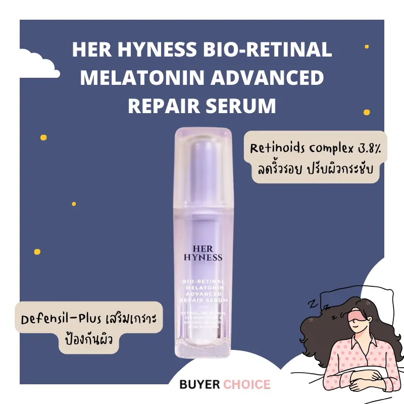 เซรั่มตัวใหม่ที่ไม่ควรพลาดจาก HER HYNESS เป็นเซรั่มเรติแนล-เมลาโทนิน เหนือขั้นกว่าเรตินอลแต่มีความอ่อนโยนต่อผิวสุด ๆ สามารถใช้ได้ทุกวัน โดยมีเนื้อสัมผัสเกลี่ยง่ายสบายผิว เป็นเนื้อน้ำนม ที่ยังคงให้ความชุ่มชื้นต่อผิวเป็นอย่างดี ไม่อุดตันผิว อีกทั้งยังปราศจากสารเคมีที่ระคายเคืองต่อผิวอีกด้วย เหมาะสำหรับใช้เฉพาะกลางคืน
