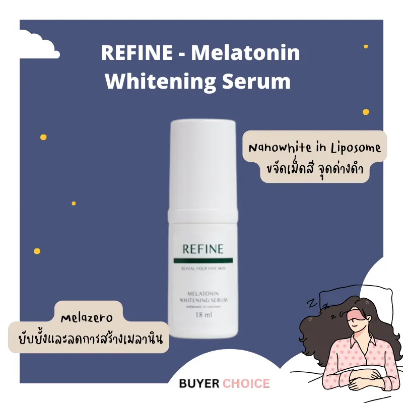 สกินแคร์ Melatonin จากแบรนด์ REFINE มาในสูตรใหม่ Melatonin Whitening Serum เหมาะสำหรับผิวบอบบาง เป็นสูตรเฉพาะของแบรนด์ด้วย MelaNano Complex ช่วยปรับผิวให้กระจ่างใสตอนกลางวัน พร้อมบูสต์พลังซ่อมแซมผิวในยามกลางคืน ที่ใช้ระยะเวลาในการพัฒนาสูตรนานถึง 2 ปี และแก้สูตรมาไม่ต่ำกว่าร้อยครั้ง เพื่อสูตรที่ดีที่สุดและเห็นผลจริง