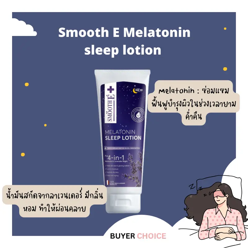Smooth E Melatonin Sleep Lotion ไอเทมเด็ดที่สาว ๆ ไม่ควรพลาด เป็นโลช้่นทาผิวที่มีส่วนผสมของ Melatonin กลิ่นลาเวนเดอร์ ตัวช่วยที่ทำให้การนอนหลับดีขึ้น สบาย คลายเครียด และผิวฉ่ำน้ำ หากต้องการมีผิวสวยดูสุขภาพดี ชุ่มชื้น และเปล่งปลั่งอย่างเป็นธรรมชาติ ต้องสมูทอีสูตรนี้เลย