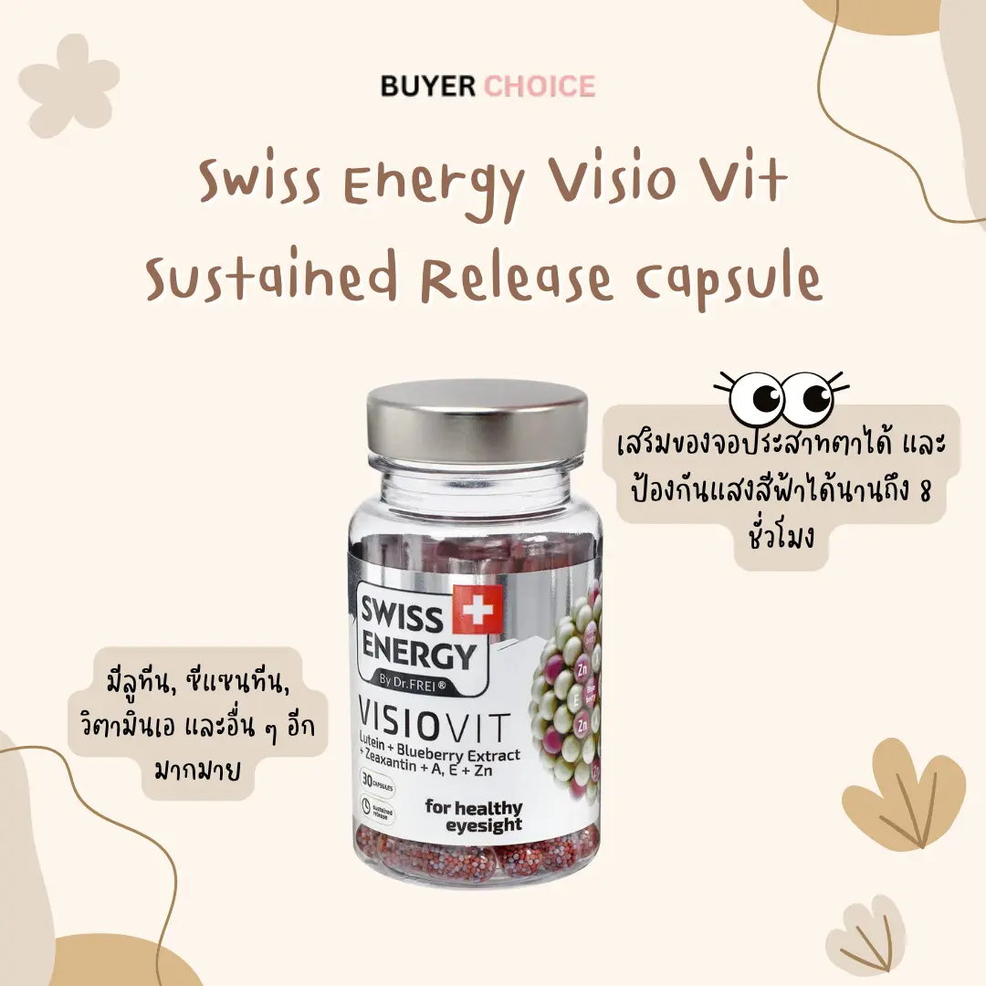 Swiss Energy Visio Vit Sustained Release Capsule เป็นอาหารบำรุงสายตา ที่ช่วยป้องกันการเสื่อมของจอประสาทตาได้ และป้องกันแสงสีฟ้าได้นานถึง 8 ชั่วโมง จึงเหมาะสมกับผู้ที่ใช้สายตาในการทำงานหน้าจอเป็นระยะเวลานาน และด้วยสูตรของวิตามินบำรุงสายตานี้ที่นำเข้าจากประเทศสวิตเซอร์แลนด์ จึงอุดมไปด้วยสารสกัดพรีเมียมมากมาย หากทานต่อเนื่อง นอกจากสายตาจะดีขึ้น ยังลด อาการตากแห้ง อาการตาล้าได้เป็นอย่างดี