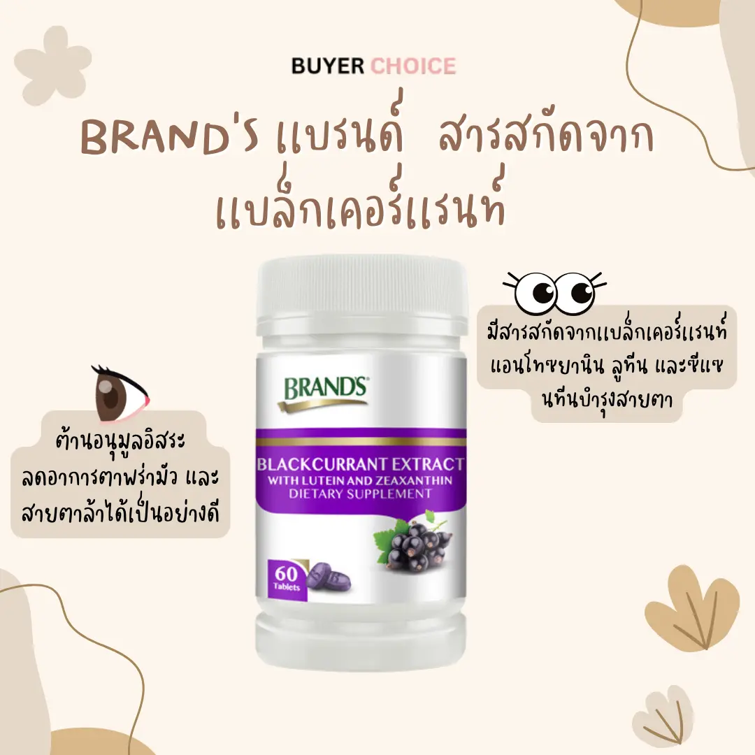 BRAND'S เเบรนด์®สารสกัดจากเเบล็กเคอร์เเรนท์ ยืนหนึ่งในวงการอาหารเสริมบำรุงสายตา ที่ยอดขายดีตลอดมา ด้วยสารสกัดหลักของอาหารเสริมนี้ มาจากเเบล็กเคอร์เเรนท์ทำให้มีคุณประโยชน์ช่วยบำรุงสายตา คืนดวงตาที่สดใส ต้านอนุมูลอิสระ ลดอาการตาพร่ามัว และสายตาล้าได้เป็นอย่างดี