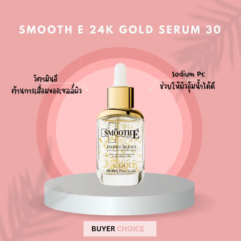 อีกหนึ่งผลิตภัณฑ์ลดเลือนริ้วรอย ที่หนึ่งในดวงใจของใครหลายคนกับ Smooth E 24K Gold Serum 30 เซรั่มที่มาในรูปแบบของเจลใส และมีผงของทองคำบริสุทธิ์ 99.99% อยู่ ช่วยบำรุง พร้อมฟื้นฟูผิวให้กระจ่างใสขึ้นได้อย่างล้ำลึก ลดเลือนริ้วรอยได้ดี มอบผิวเด้งฉ่ำวาว และช่วยชะลอการเสื่อมสภาพของเซลล์ผิว