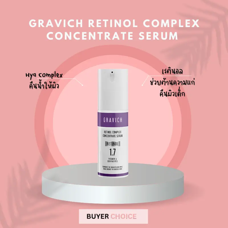 ถ้าจะให้พูดถึงผลิตภัณฑ์ที่ชะลอความแก่ของผิว ทึ่ช่วงนี้กระแสมาแรงเป็นที่พูดถึงกันมากที่สุด คือ เรติรอลเลย ซึ่ง Gravich Retinol Complex Concentrate Serum เป็นเรตินอลที่มาในรูปแบบของเนื้อเซรั่ม มีเรตินอลที่เข้มข้นมาก จึงช่วยแก้ปัญหาริ้วรอยล่องลึกต่าง ๆ ให้ตื้นขึ้นได้ พร้อมลดเลือนความหมองคล้ำบนผิวหน้า แถมผิวหน้าที่เป็นสิวก็จะค่อย ๆ ดีขึ้นได้อีกด้วย