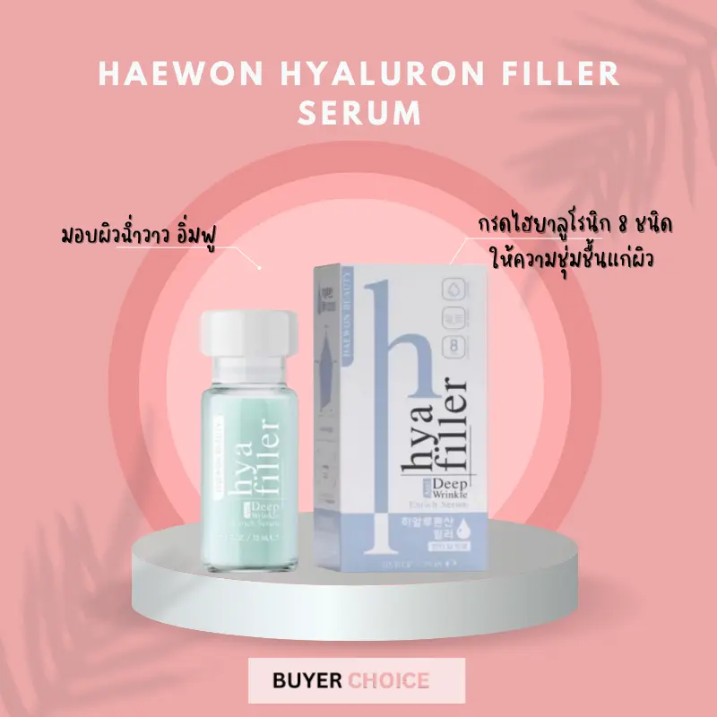 HAEWON Hyaluron Filler serum เซรั่มลดเลือนริ้วรอยที่นำเข้าจากเกาหลี ซึ่งเป็นอีกหนึ่งผลิตภัณฑ์ที่เคลมมาว่าเป็นฟิลเลอร์แบบทา ช่วยให้ผิวกระชับ รูขุมขนเล็กลง เผยหน้าดูเต่งตึงอ่อนเยาว์ และลดเลือนริ้วรอย ทั้งรอยตีนกา ปัญหาผิวแห้งขาดน้ำ จุดด่างดำต่าง ๆ จะค่อย ๆ ดีขึ้น ริ้วรอยตื้นขึ้นและผิวสว่างขึ้นได้อีกระดับ