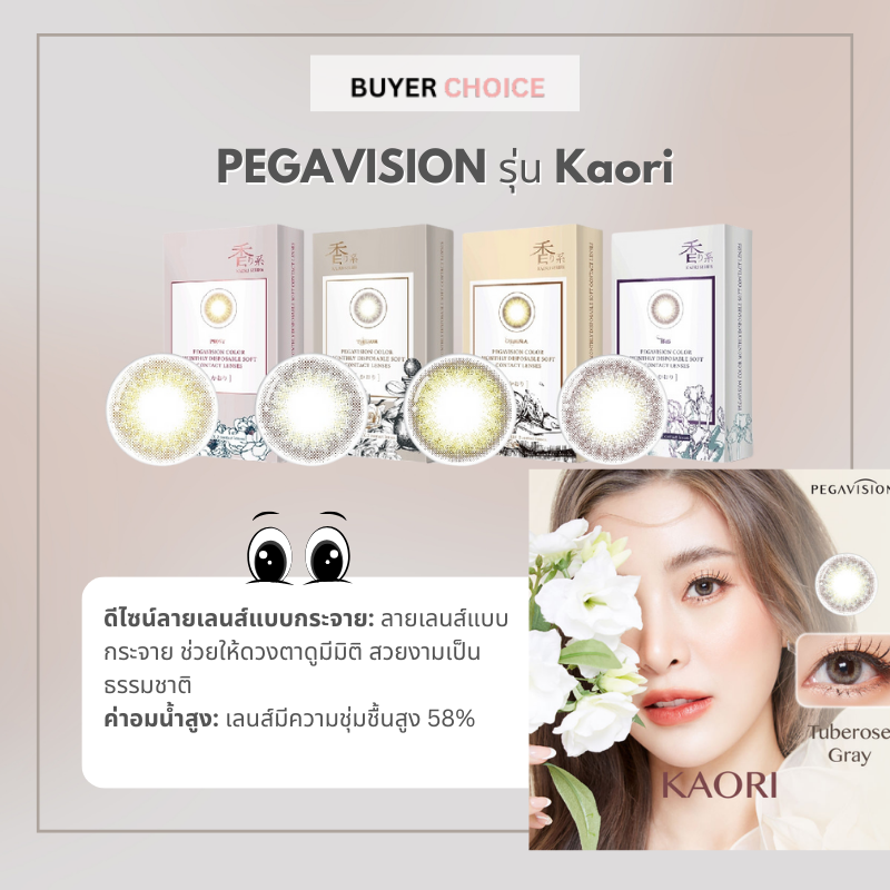 คอนแทคเลนส์สี รายวัน PEGAVISION รุ่น Kaori สีเลนส์สวยงามมาก กลมกลืนกับสีตาจริง ด้วยลายเลนส์แบบกระจาย ช่วยให้ดวงตาดูมีมิติ เล่นแสงมากขึ้น มาพร้อมกับเลนส์มีความชุ่มชื้นสูง รู้สึกสบายตาตลอดวัน ขอบเลนส์บางเบา สวมใส่สบาย ไม่รู้สึกเหมือนมีอะไรอยู่บนตา