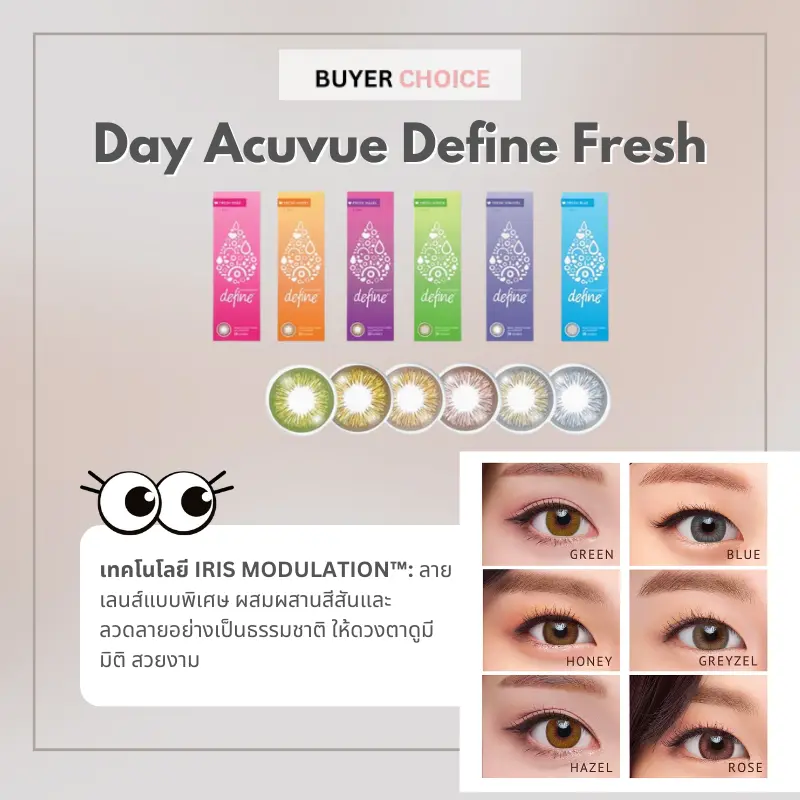 Acuvue คอนแทคเลนส์สี รายวัน Acuvue Define Fresh สี Fresh Grayzel และ Fresh Honey คอนแทคเลนส์ผสานสีสันและลวดลายอย่างเป็นธรรมชาติ ให้ดวงตาดูมีมิติ สวยงาม พร้อมปกป้องดวงตาจากรังสียูวี