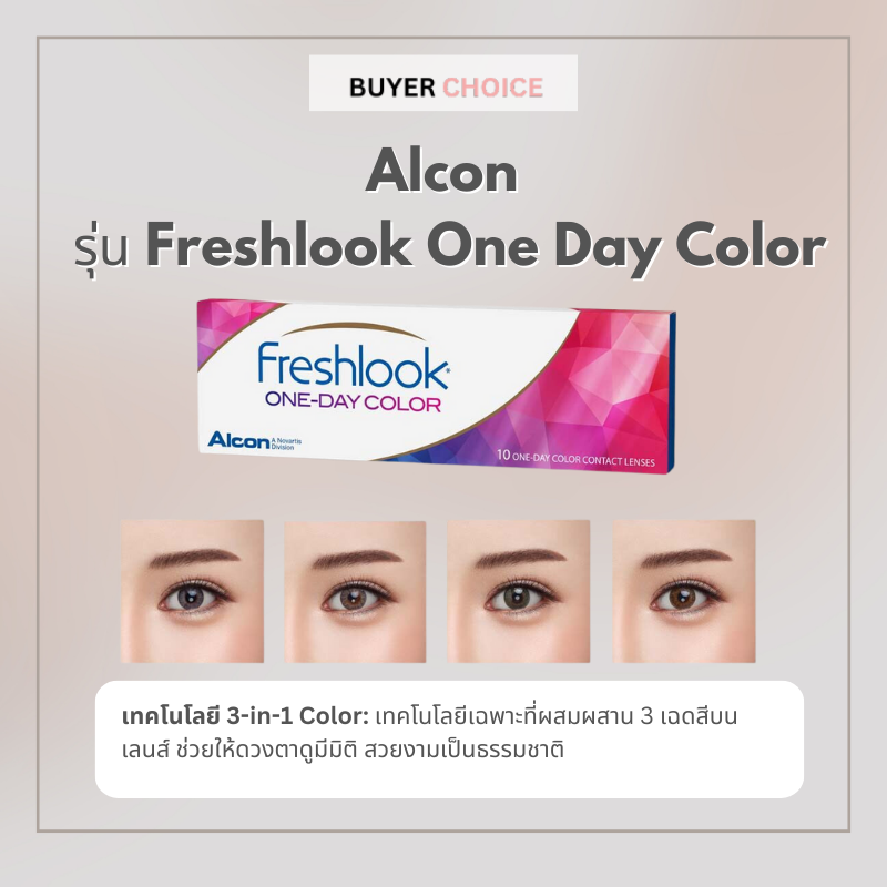 คอนแทคเลนส์สี รายวัน Alcon ออลคอน รุ่น Freshlook One Day Color มาพร้อมเทคโนโลยี 3-in-1 Color เบลนด์ 3 ประกายสีด้วย เพื่อดวงตาที่ดูโดดเด่น อย่างเป็นธรรมชาติ