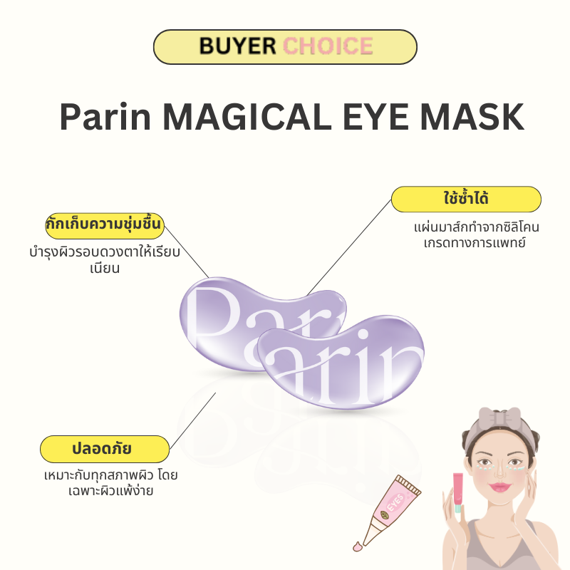 Parin เมจิคอล อาย มาสก์ แผ่นมาส์กใต้ตาชนิดใช้ซ้ำได้ ผลิตจากซิลิโคนเกรดทางการแพทย์ ช่วยกักเก็บความชุ่มชื้น บำรุงผิวรอบดวงตาให้เรียบเนียน กระชับ และลดเลือนริ้วรอยใต้ตาได้