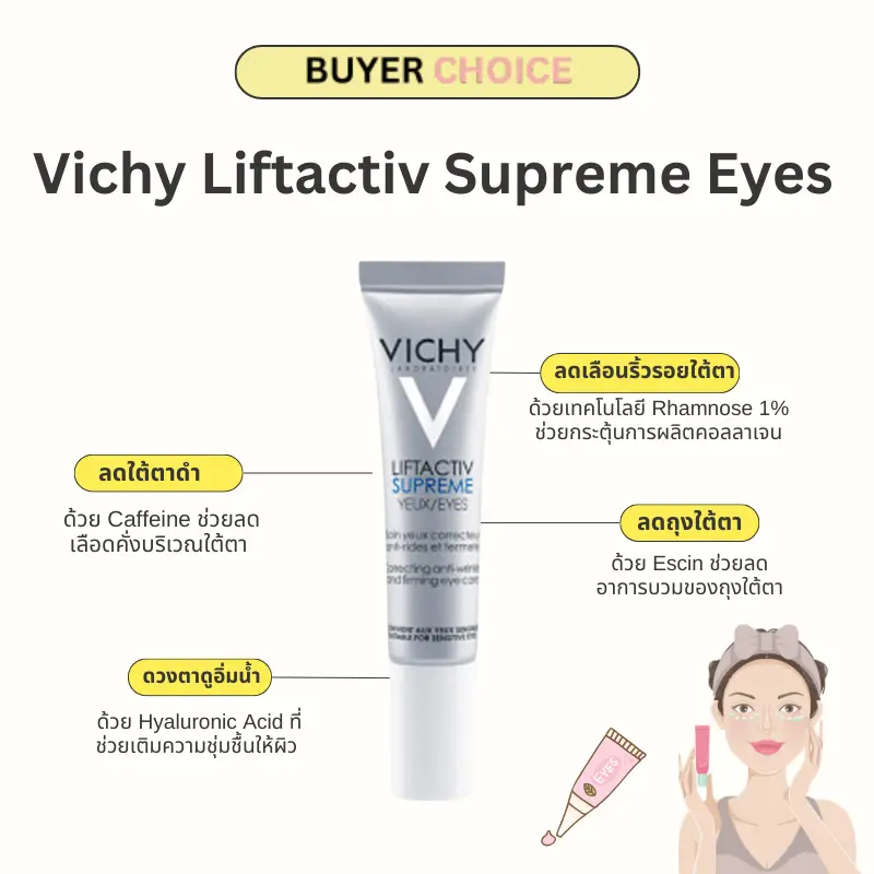 วิชี่ ลิฟแอ็คทีฟ สุพรีม อายส์ ครีมบำรุงผิวรอบดวงตา พร้อมลดเลือนริ้วรอย ทั้งรอยคล้ำ และถุงใต้ตา อุดมไปด้วยส่วนผสมทรงพลัง เหมาะกับทุกสภาพผิว โดยเฉพาะผิวแพ้ง่าย