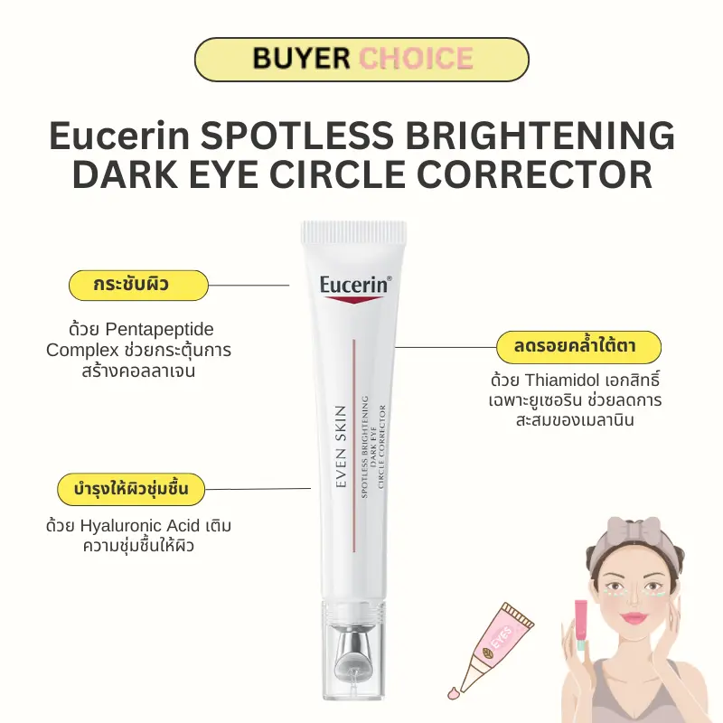 ยูเซอริน สปอตเลส ไบรท์เทนนิ่ง ดาร์ก อาย เซอร์เคิล คอร์เรคเตอร์ อายครีมจากแบรนด์เวชสำอางยอดขายอันดับ 1 ในเมืองไทย แบรนด์นี้เป็นที่รู้จักกันดีอยู่แล้วกับประสิทธิภาพ และความอ่อนโยชน์ต่อผิว น้องคนนี้จะช่วยลดเลือนรอยคล้ำใต้ตา กระชับผิวรอบดวงตา พร้อมเผยผิวรอบดวงตาที่ดูสว่างสดใส