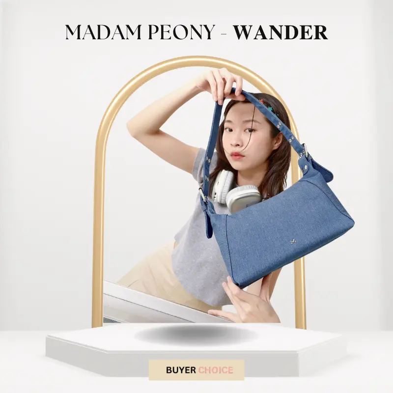 Madam Peony แบรนด์กระเป๋าไทยที่โด่งดังเรื่องดีไซน์น่ารัก ทันสมัย และราคาสบายกระเป๋า มาในทรงสี่เหลี่ยมผืนผ้า ขนาดกำลังดี ผลิตจากหนัง VEGAN สัมผัสนุ่มฟิน ให้ความรู้สึกเหมือนหนังแกะ