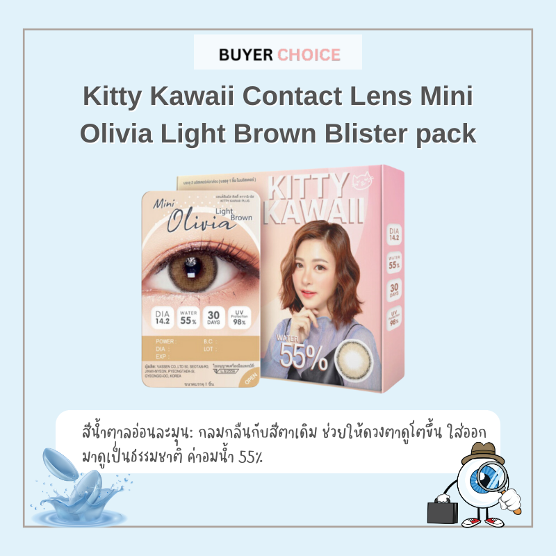 Mini Olivia Light Brown Blister pack เป็นคอนแทคเลนส์รายเดือนจากแบรนด์ Kitty Kawaii ผลิตจากวัสดุ HEMA โดดเด่นด้วยสีน้ำตาลอ่อนที่เป็นธรรมชาติ เหมาะกับการใส่ออกงานหรือใส่วันธรรมดา มาพร้อมคุณสมบัติเด่น ดังนี้: