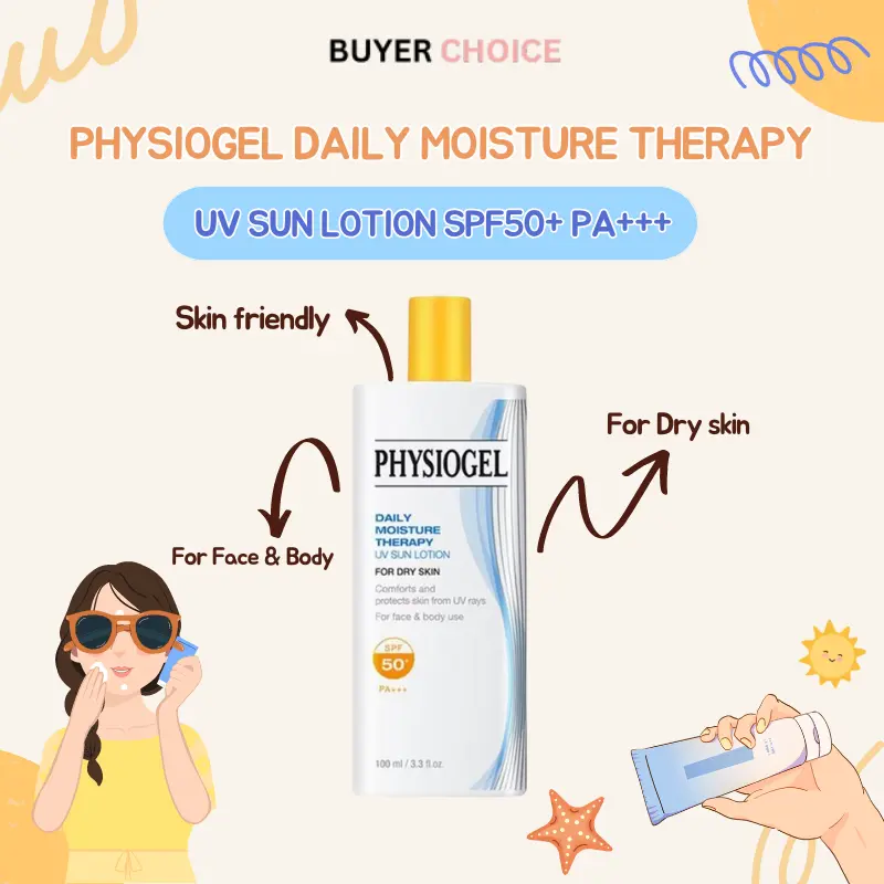 กันแดดหน้าฉ่ำ ตัวไหนดีคำถามที่สาว ๆ หลายคนสงสัย เพื่อมาป้องกันแสงแดดสุดจ้าในช่วงซัมเมอร์นี้ BuyerChoice ขอแนะนำ ฟิสิโอเจล เดลี่ มอยซ์เจอร์ เธอราปี ยูวี ซัน โลชั่น เอสพีเอฟ 50+ พีเอ+++ ผลิตภัณฑ์ป้องกันแสงแดดมาในสูตรโลชั่น เนื้อบางเบาสบายผิว ไม่ว่าทุกคนจะมีสภาพผิวแบบไหนก็สามารถใช้ได้ โดยเฉพาะผิวบอบบางแพ้ง่าย