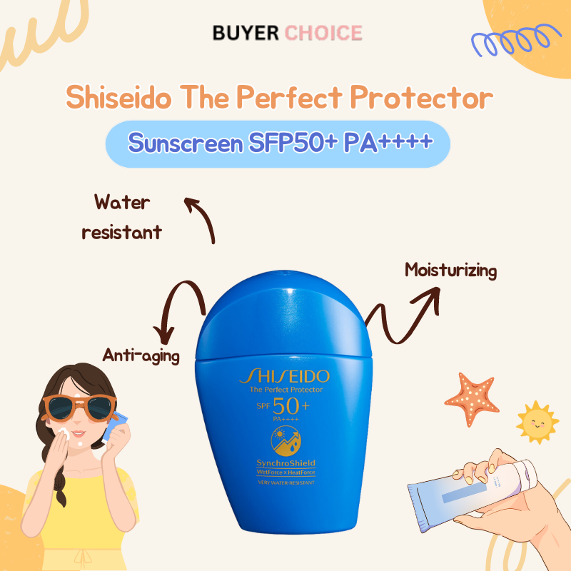 Shiseido The Perfect Protector SPF50+ PA++++ ครีมกันแดดหน้าตัวดัง มาในสูตรใหม่ที่มีเทคโนโลยี SynchroShield เพื่อเพิ่มประสิทธิภาพในการปกป้องผิว เมื่อต้องสัมผัสกับปัจจัยต่าง ๆ ไม่ว่าจะเป็นแสงแดด น้ำ เหงื่อ ความร้อน หรือแม้แต่ฝุ่นละอองต่าง ๆ ก็ตาม การมีตัวช่วยดี ๆ อย่างครีมกันแดดสูตรนี้ถือว่าตอบโจทย์สุด ๆ
