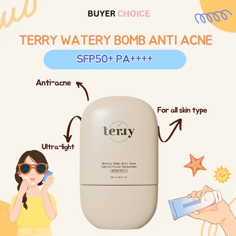 ปังไม่ไหวกับครีมกันแดดหน้า Terry Watery Bomb Anti Acne หรือที่เรียกกันว่ากันแดดหน้าสูตรใหม่จากสารสกัดดอกดาหลา เป็นไอเทมเด็ดตัวช่วยดี ๆ ที่น่าสนใจ ด้วยมีประสิทธิภาพในการกันแดดสูงถึง SPF50+ PA++++ และช่วยลดสิวได้ในหลอดเดียว