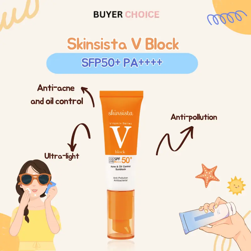 Skinsista V Block ยืนหนึ่งในเรื่องรีวิวมากมายในแพลตฟอร์มต่าง ๆ ไม่ว่าจะเป็น TikTok , Facebook หรือแม้แต่ pantip ก็ตาม เรียกได้ว่าขึ้นชื่อสุด ๆ เป็นครีมกันแดดที่ถูกและดีมีอยู่จริงในราคานักศึกษา มีค่า SPF50+ PA++++ เป็นทั้งกันแดดหน้า กันสิว กันฝ้า และกันฝุ่น PM2.5 ไปในตัว รวมถึงอุดมไปด้วยสารสกัดอันทรงคุณค่าจากธรรมชาติมากมาย