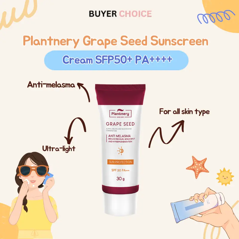 ครีมกันแดดหน้า Plantnery Grape Seed Sunscreen Cream SPF50+ PA++++ ด้วยคุณสมบัติ 2 in 1 มาในสูตรปกป้องผิวจากแสงแดด ลดฝ้า กระ และจุดด่างดำที่เกิดขึ้นบนใบหน้า ให้ผิวกระจ่างใสขึ้นกว่าเคยอีกด้วย