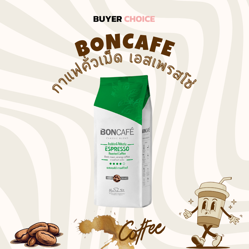 สำหรับคนรักเอสเพรสโซ่เข้มข้น! Boncafe คลาสสิค เอสเพรสโซ่ อราบิก้าผสมโรบัสต้า ตัวนี้ตอบโจทย์สุด ๆ ด้วยรสชาติที่เข้มข้น หอมกรุ่น และเป็นที่คุ้นเคยของใครหลายๆ คน กลิ่นหอมของกาแฟคั่วเข้มชัดเจน รสชาติเข้มข้น มีความเปรี้ยวเล็กน้อย สามารถใช้ชงได้หลายแบบ ทั้งเอสเพรสโซ่ คาปูชิโน่ หรือจะชงดำก็อร่อย